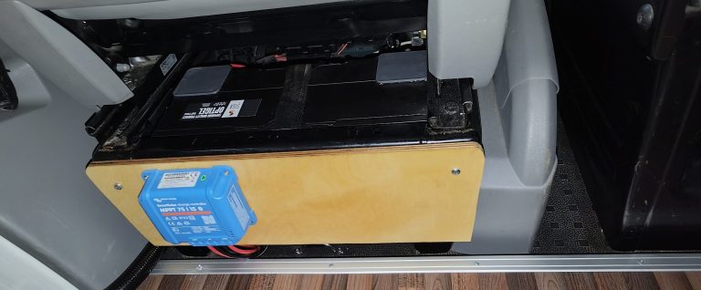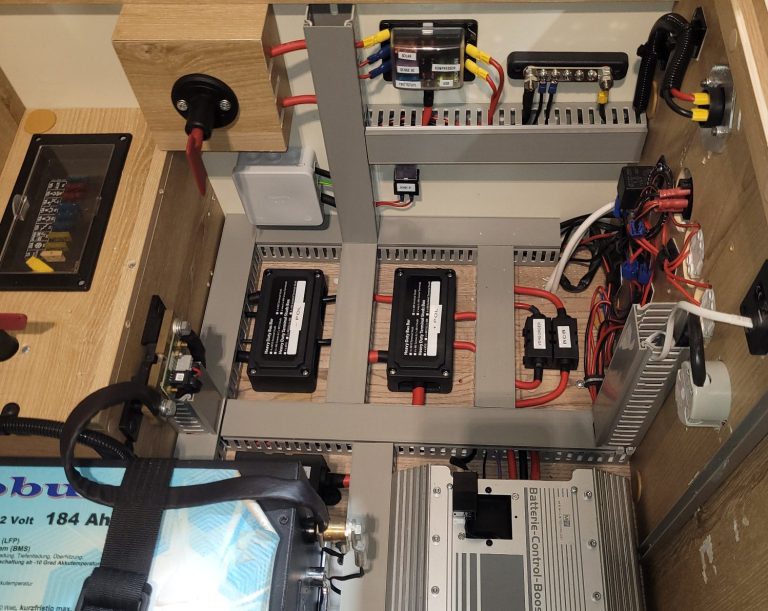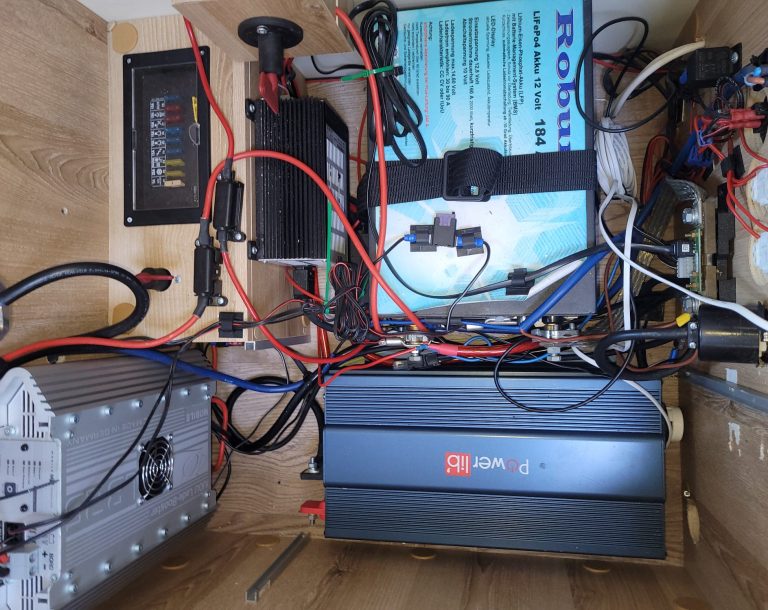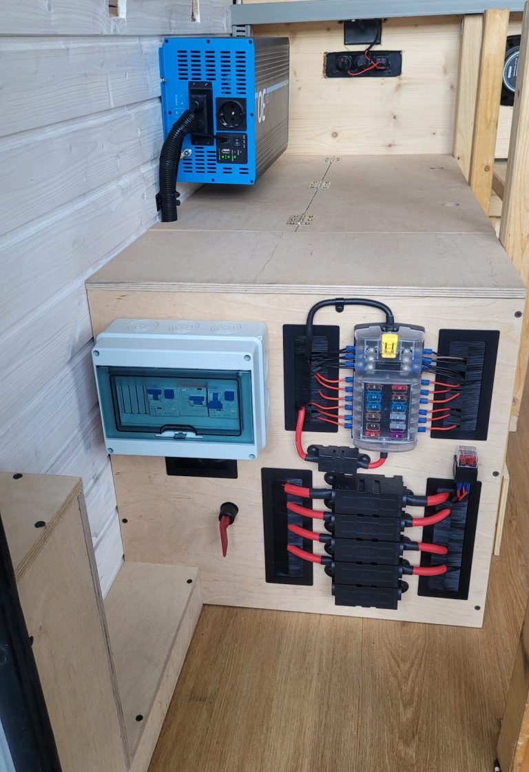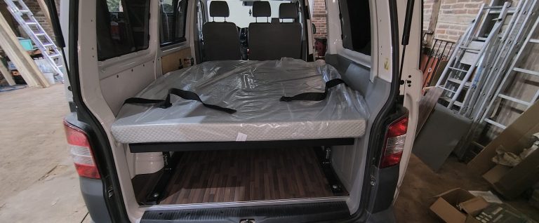 Ein vorgefertigtes Bettgestell passend zu dem T5, sorgt für eine komfortable Schlafmöglichkeit und optimalen Stauraum darunter. Für die elektrische Versorgung wurde eine Zusatzbatterie unter dem Fahrersitz installiert, ergänzt durch ein leistungsstarkes Ladegerät und ein Batterieüberwachungssystem zur sicheren Kontrolle aller Verbraucher.